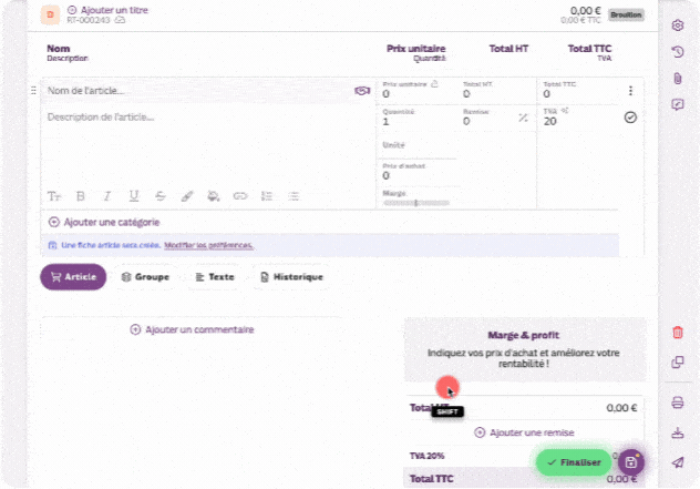 - 2. Créez votre document : dès que vous ajoutez cet article à un devis ou une facture, INFast affiche votre marge en temps réel sur votre écran de création sur laquelle vous pouvez jouer directement.
